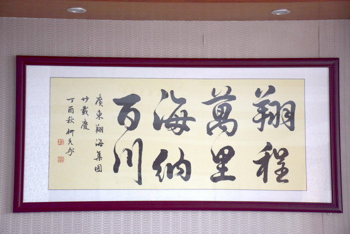 “翔程万里,海纳百川”,佛山市著名书法家亲自提笔,祝贺广东华体会平台集团20周年庆典。