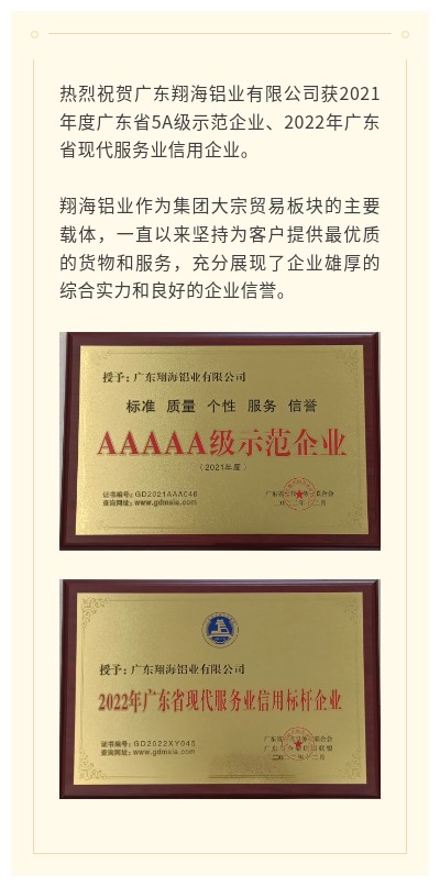 喜报 | 华体会平台铝业获评广东省5A级示范企业、现代服务业信用标杆企业